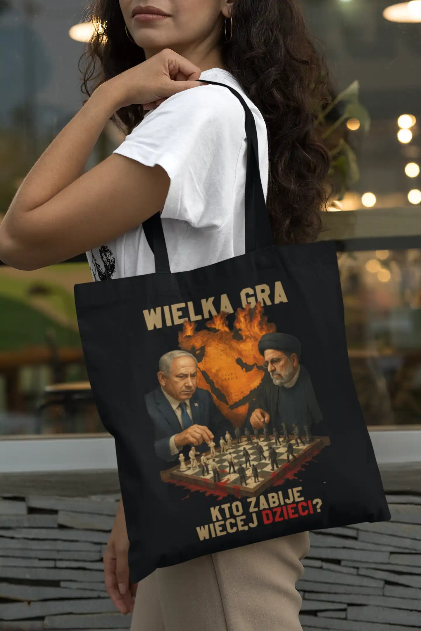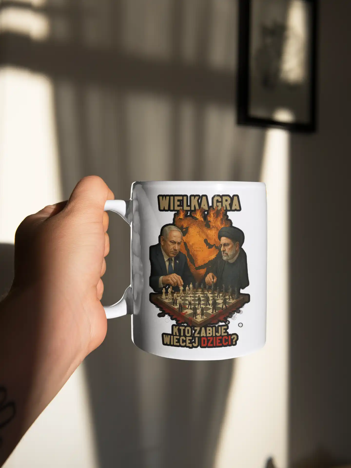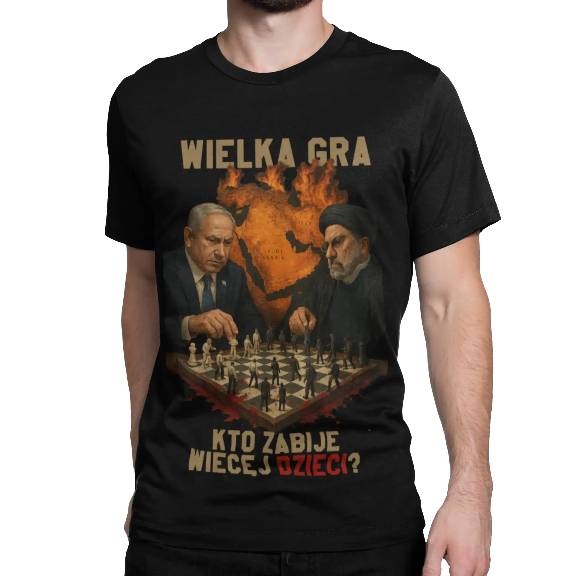 Na grafice widzimy dwóch liderów politycznych siedzących naprzeciw siebie przy szachownicy. W tle płonie mapa Bliskiego Wschodu, symbolizując napięcia geopolityczne i konflikty zbrojne.
