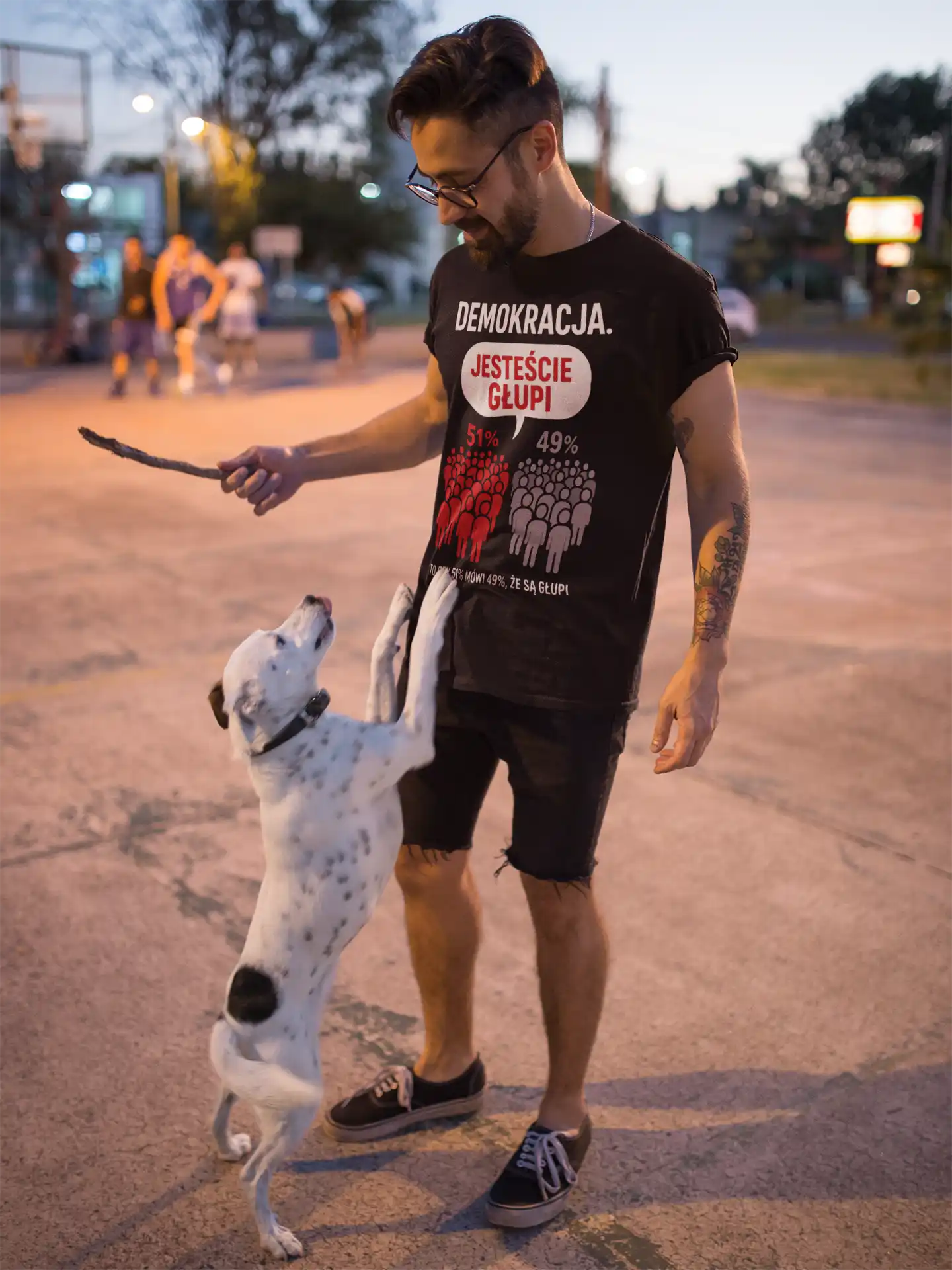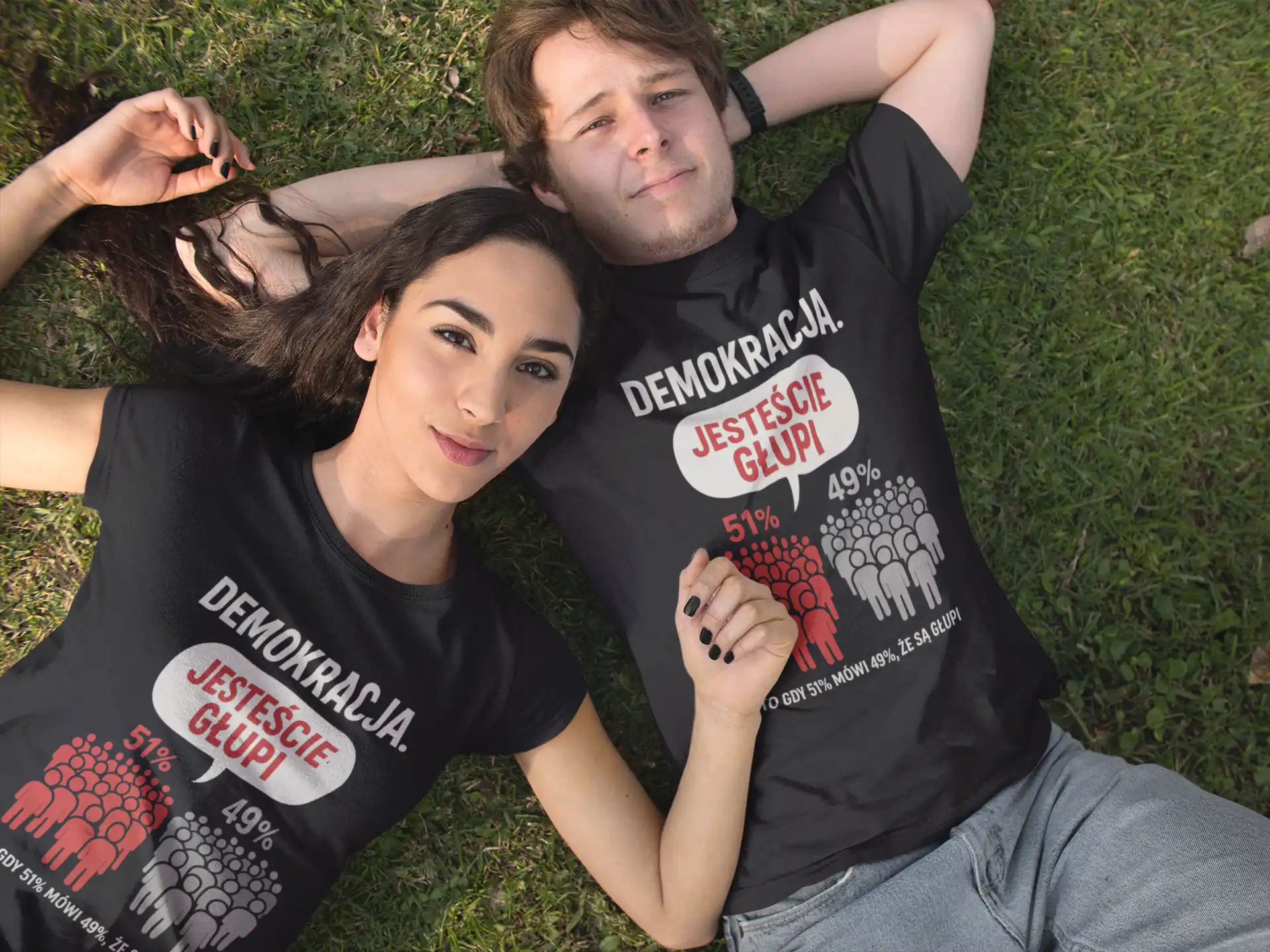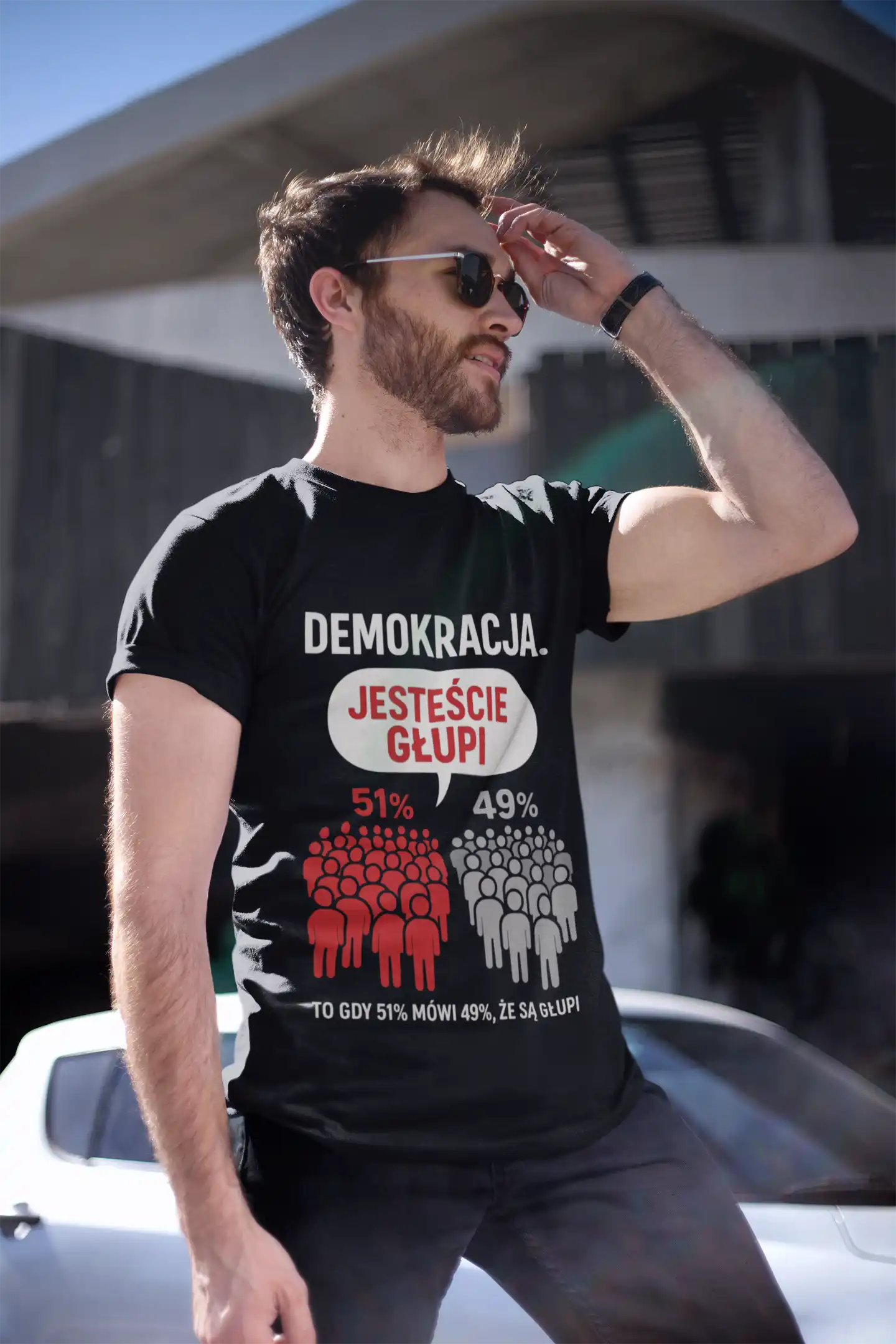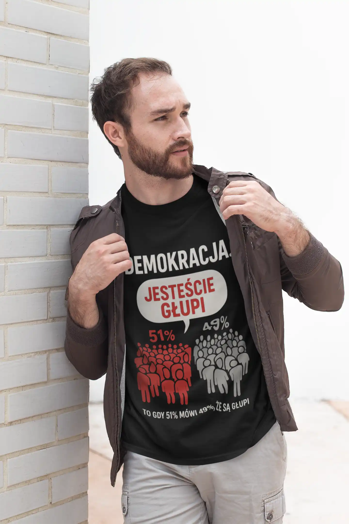 Koszulka „Demokracja Jesteście Głupi 51% 49%” pokazuje paradoks demokracji w prosty i humorystyczny sposób.
