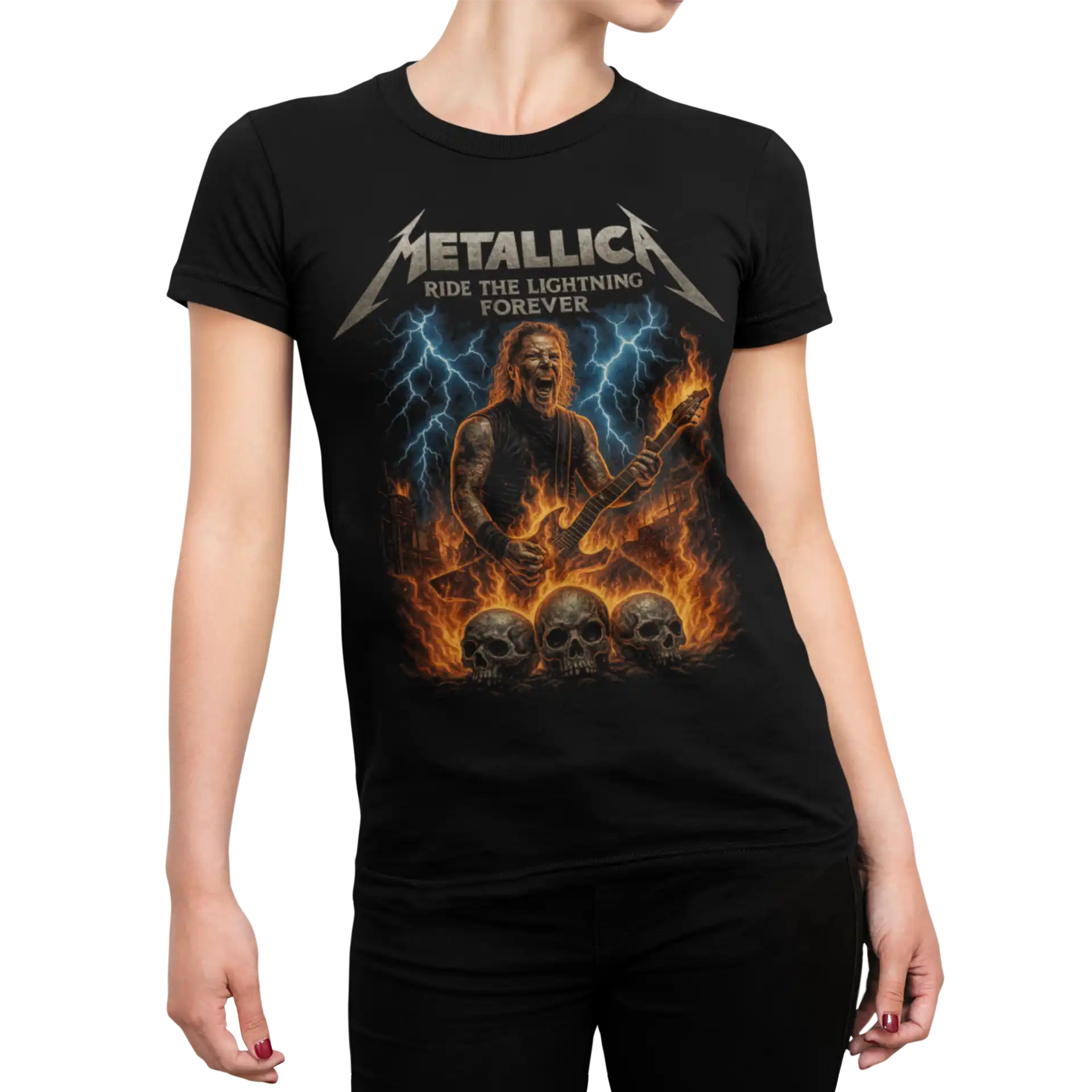 Design przedstawia Jamesa Hetfielda – frontmana Metalliki – w intensywnej, koncertowej scenie z ogniem i piorunami. Jeśli szukasz fraz typu „koszulka James Hetfield”, „Metallica Ride The Lightning koszulka”, „koszulka Metallica wokalista” – to dokładnie ten klimat.
