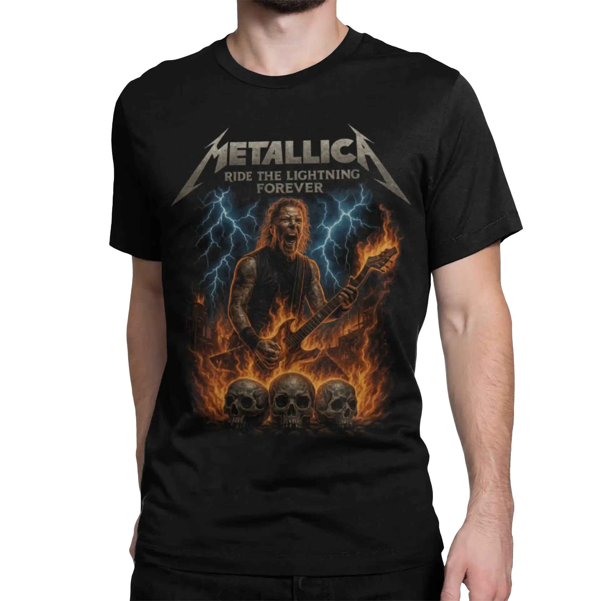 Design przedstawia Jamesa Hetfielda – frontmana Metalliki – w intensywnej, koncertowej scenie z ogniem i piorunami. Jeśli szukasz fraz typu „koszulka James Hetfield”, „Metallica Ride The Lightning koszulka”, „koszulka Metallica wokalista” – to dokładnie ten klimat.