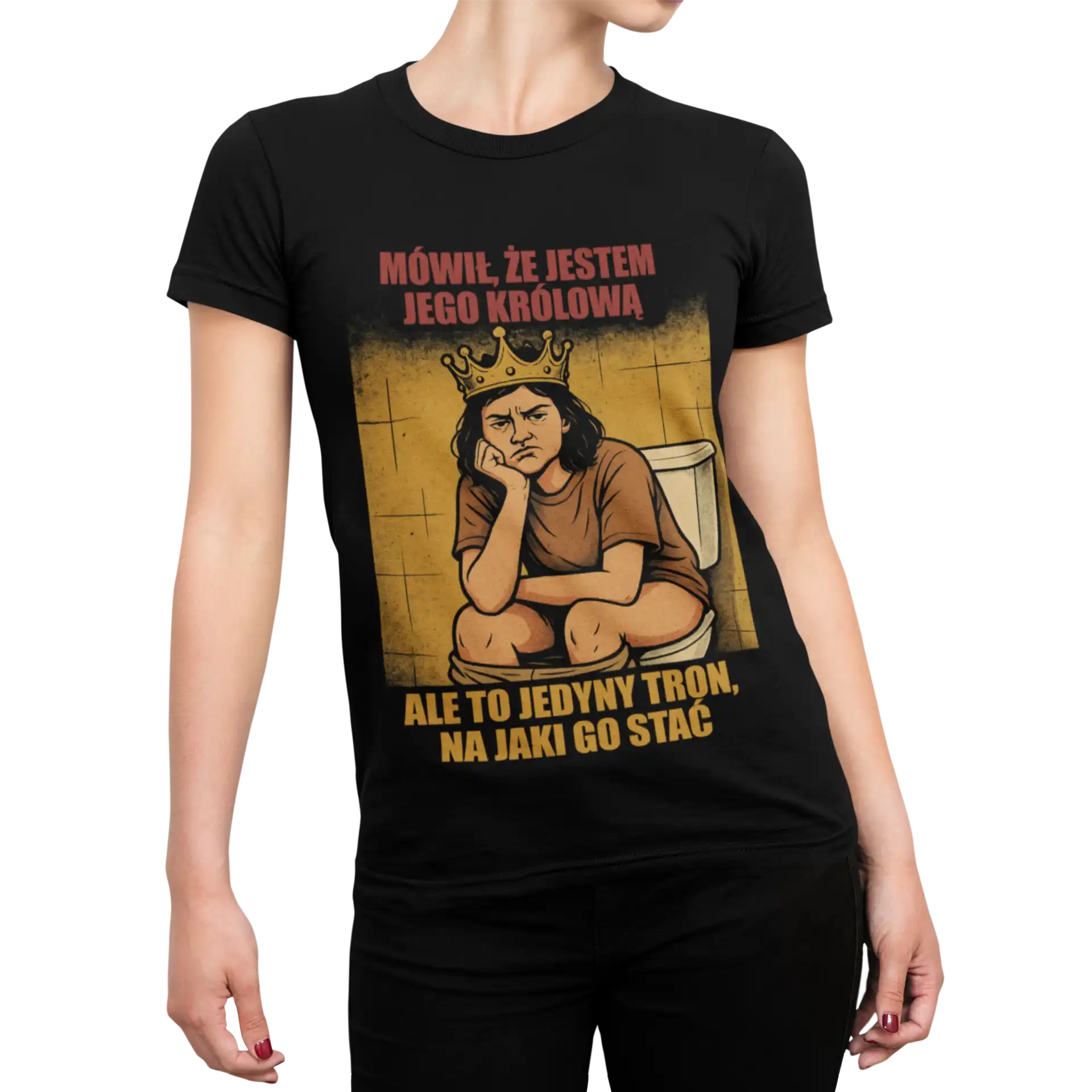 Koszulka „Mówił, że jestem jego królową – ale to jedyny tron, na jaki go stać” to ironiczny i mocno humorystyczny komentarz do relacji i wielkich obietnic.