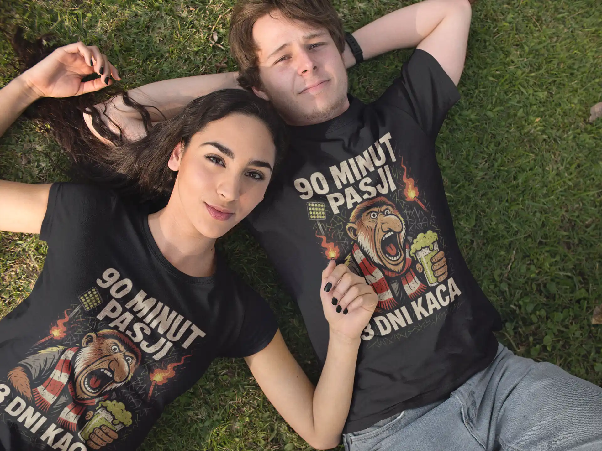 Koszulka „90 minut pasji, 3 dni kaca” to kultowy Nosacz w roli zagorzałego kibica – z szalikiem, kuflem i ogniem w oczach.