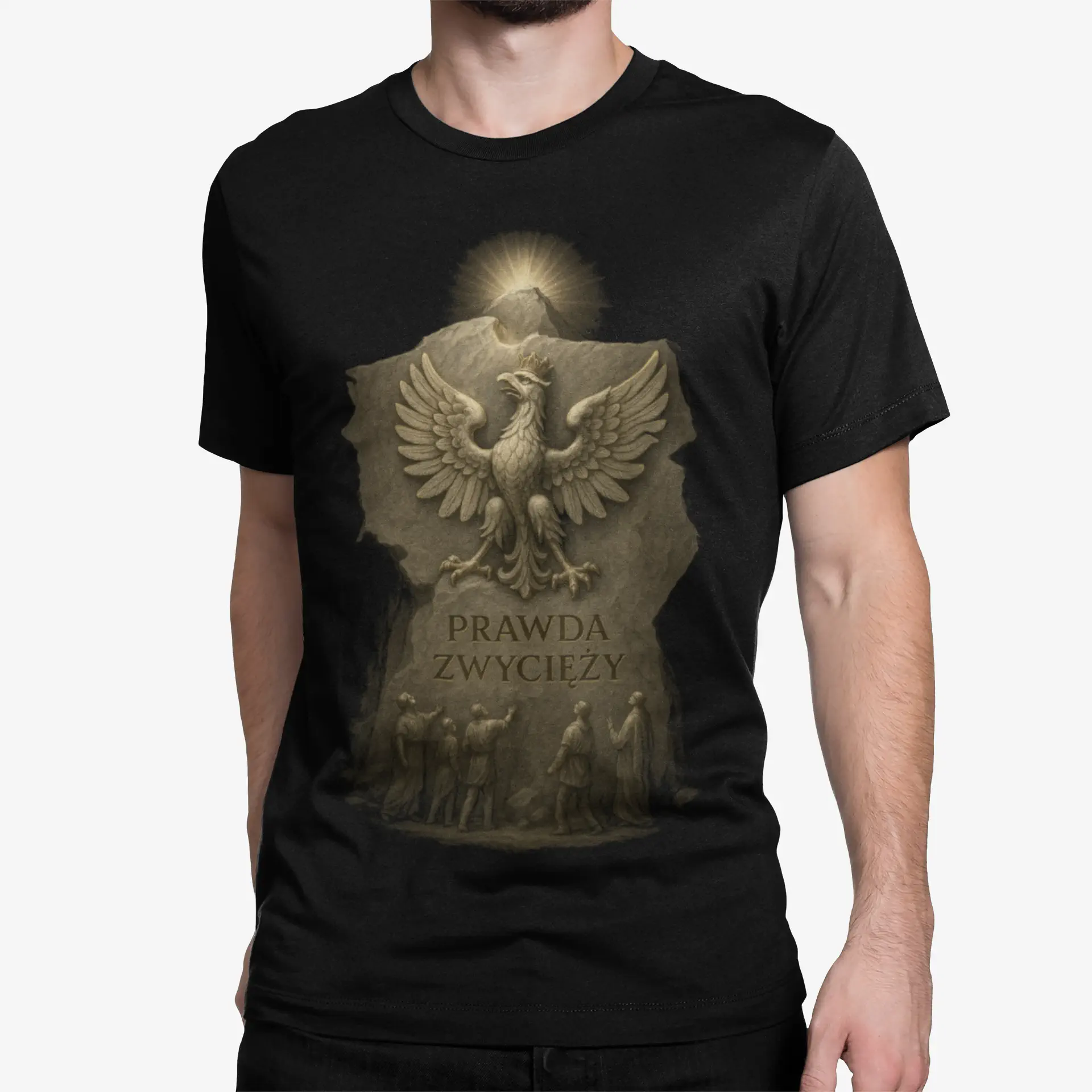 Koszulka „PRAWDA ZWYCIĘŻY” marki BIAŁOCZERWONI – majestatyczny orzeł w koronie wyrzeźbiony w kamieniu, symbol ducha, wiary i sprawiedliwości.
