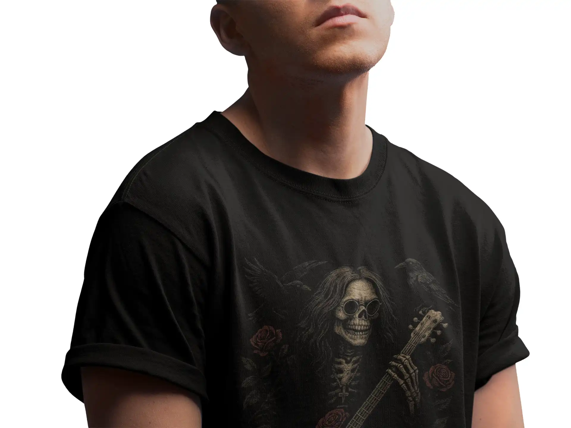 Motyw szkieletu z gitarą, otoczonego różami i krukami, symbolizuje wieczność muzyki, która nigdy nie milknie.